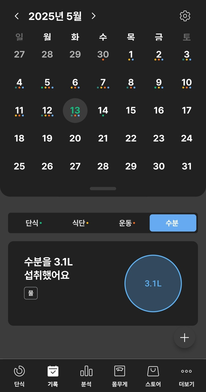 총 3.1L 섭취 완료 - ✔️ 체지방 연소하는데 산소가 필요하고 물 안에는 산소가 있다는 걸 명심하자