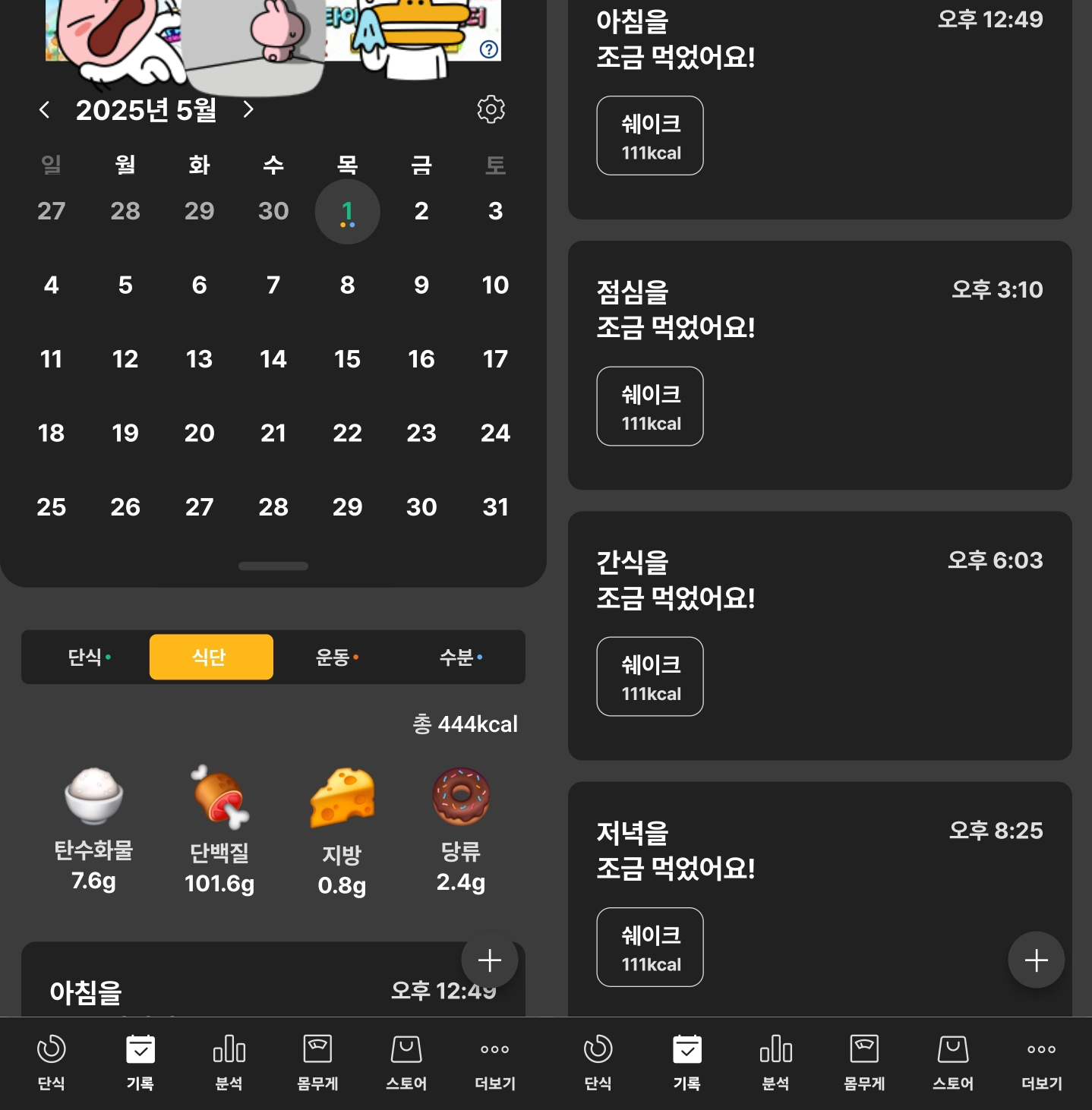 점심 | 15:10 | 단백질 쉐이크 (초코맛) |