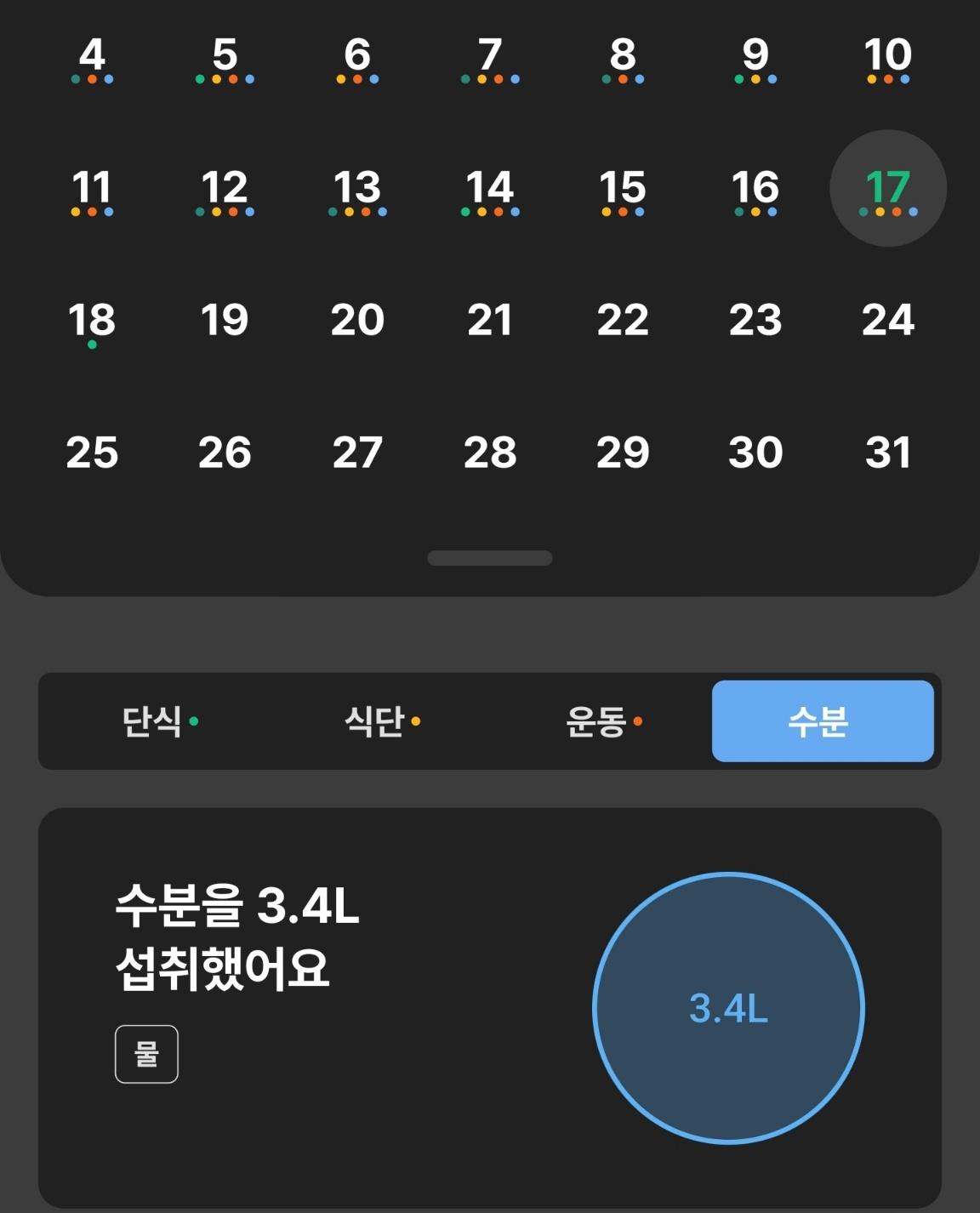 휴식 사이에 마시면서 3.4L 정도 마셨다. 미온수만 먹으니 화장실을 덜 간다. 내몸에 미온수가 맞는 듯하다. 어제와 동일하게 마실 수 있었다. 그래도 3L정도는 채웠다 최대한 4리터를 목표로 섭취해야겠다. 총 3.4L 섭취 완료