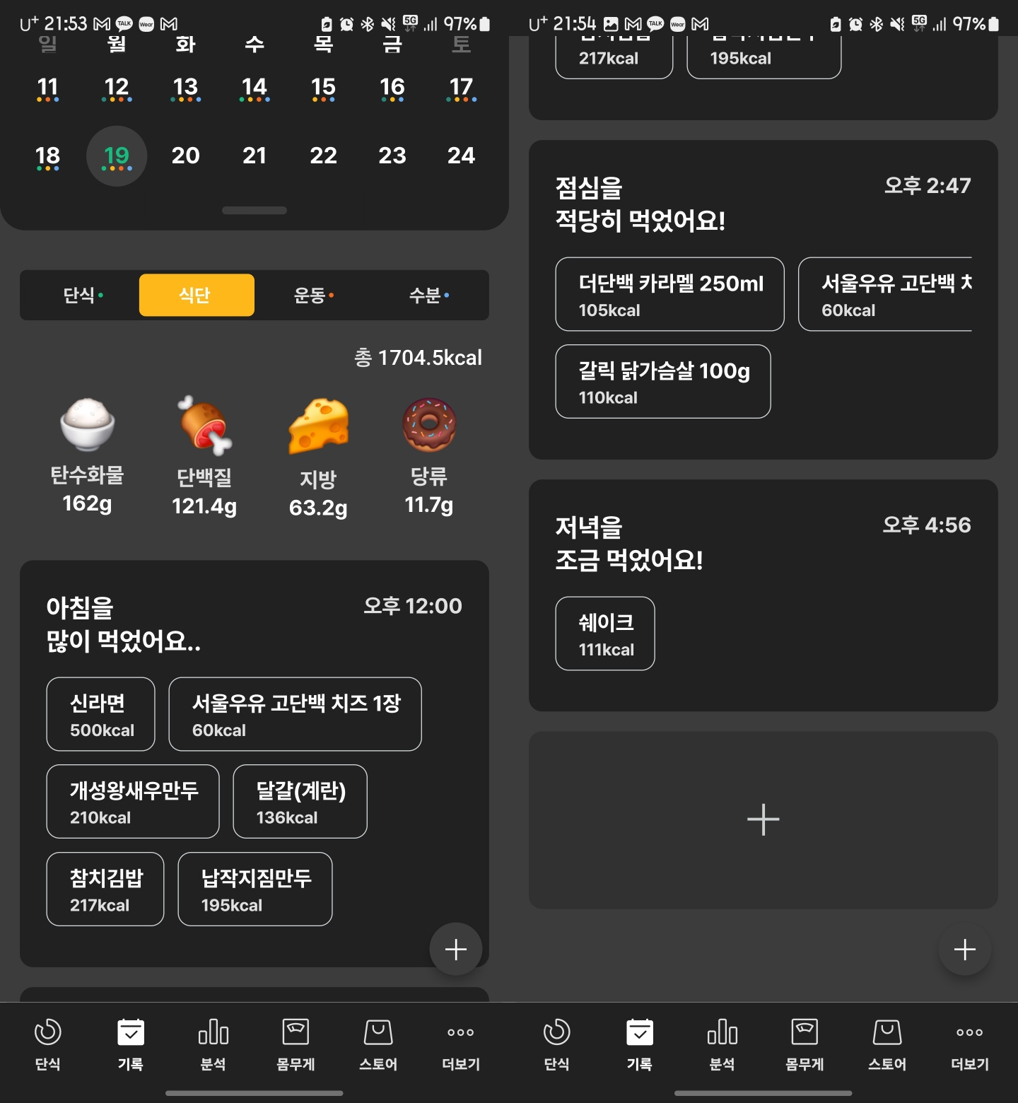 📌 섭취 칼로리 / 영양소 : 1705kcal / 탄수162 단백질121.4 지방63.2 당류11.7 애사비를 마시니 그래도 탄수화물이 들어가고나서 당이 땡기는 현상은 줄었다. 아침 결과를 보고 현타를 느껴 치팅 주를 기획했다. 어차피 주말에 치팅데이인 것을 1주일 동안 치팅기로 사용해 활동량을 올리고 음식량도 올린 상태를 적응해보려한다. 라면 만두 김밥이 원래 다먹을 수 있는 조합인데 아래사진 만큼 남기게 되었다.. 위장은 작아진 것이 맞고 식욕조절도 잘된다. 저렇게 먹고나서는 배고픔이 없다.
