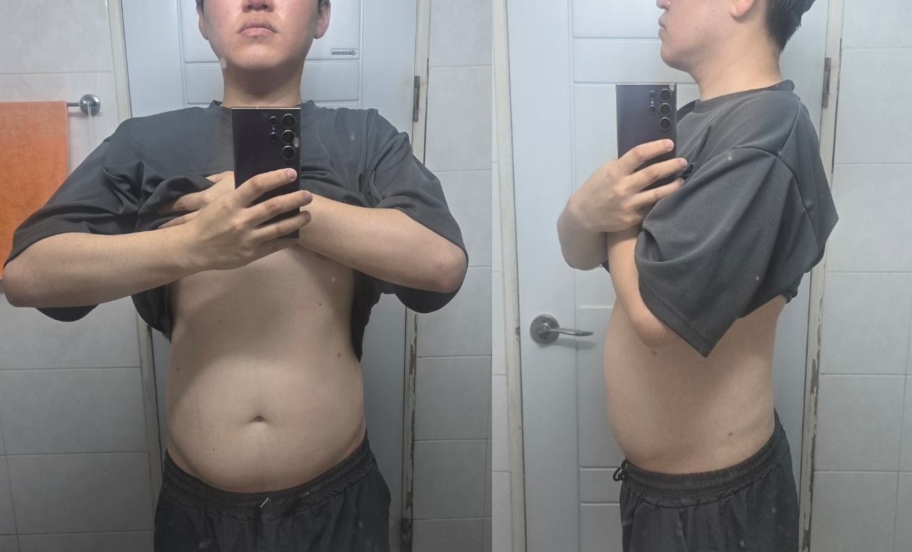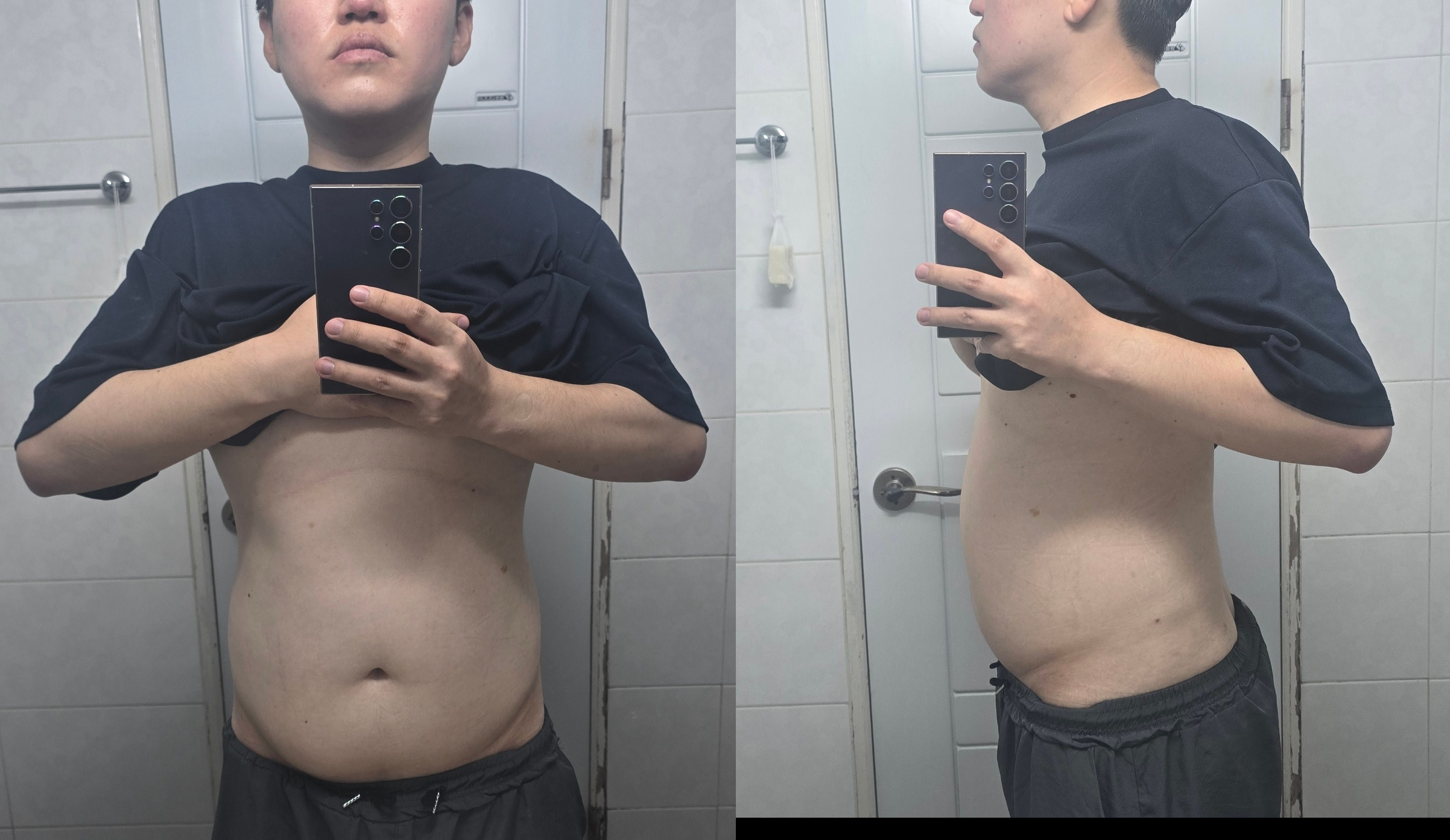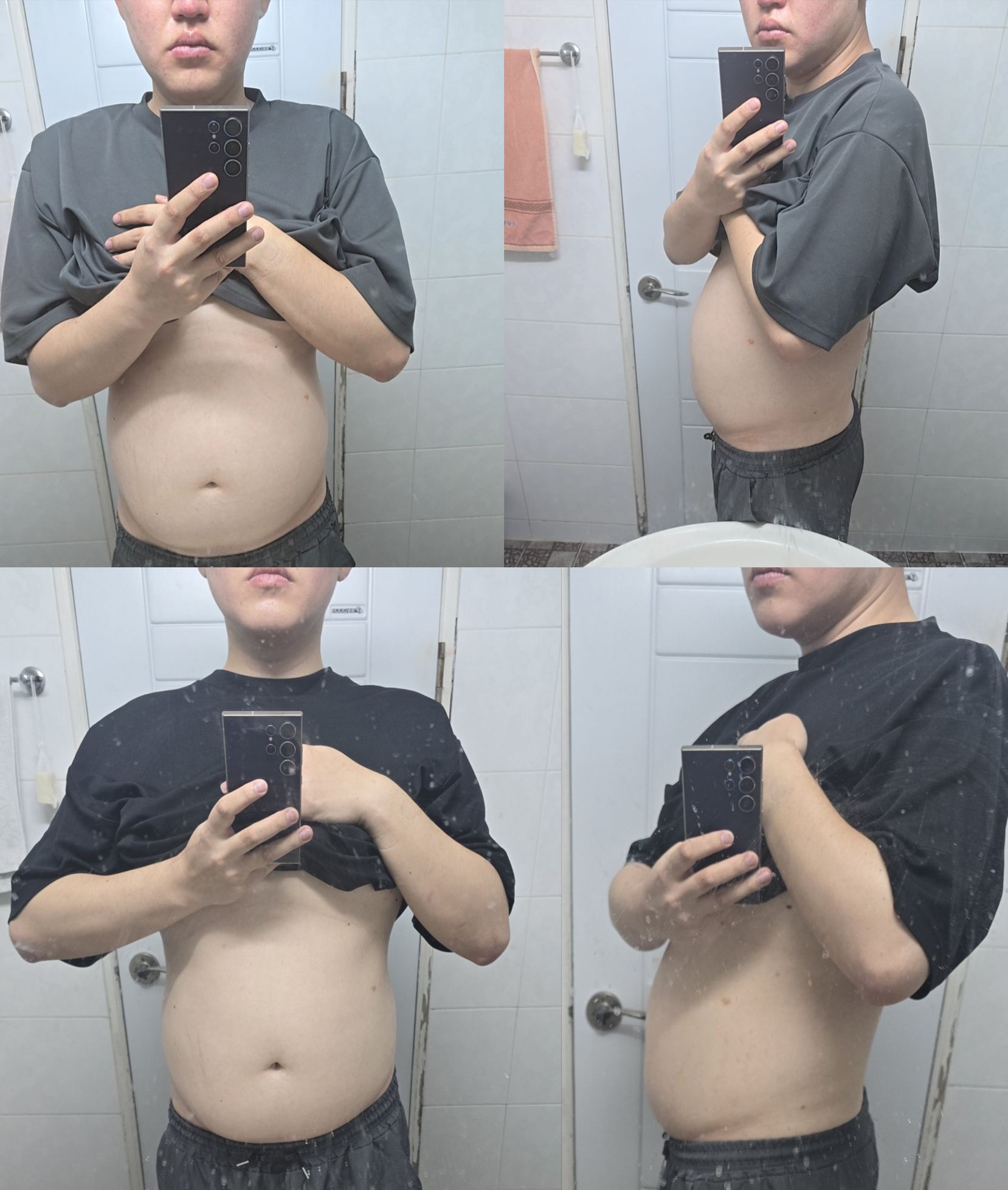 사진은 위에서 부터 시작일 1주차 2주차 3주차이다. 촬영과 허리둘레 측정시 배에 힘주지 않고 최대한 내민 상태로 찍었다. 피부 진짜 너무 하얀데.. 몸 좋아지면 태닝 고민해야겠다. 워치상태가 좋지 않아서 체중계 값으로 체성분을 측정을 진행한다. 치팅 5일차 아침이다 변화가 미미하게 존재한다. 4일차에 먹은 것은 3일차 대비 탄수는 늘리고 당과 지방을 줄이는 식사를 진행했다. 야채는 꾸준히 먹고 있다. 배부르면 수저를 놓는 식습관을 토요일 일요일은 제외하고 할 예정이 었으나 심신미약 상태로 탄수화물을 폭식하게 되었다.