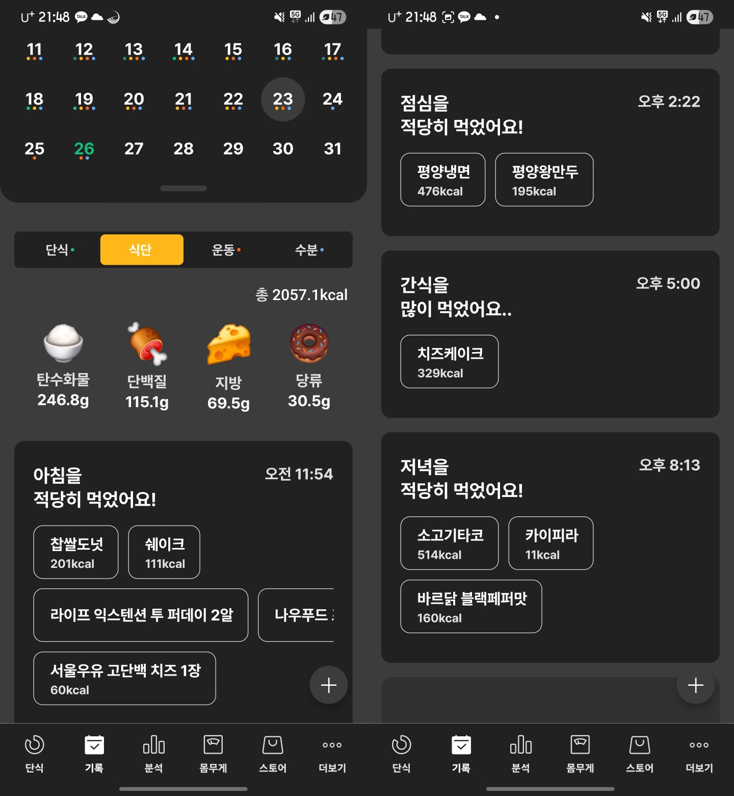 📌 섭취 칼로리 / 영양소 : 2057kcal / 탄수246.8 단백질115.1 지방69.5 당류30.5 애사비를 마시니 그래도 탄수화물이 들어가고나서 당이 땡기는 현상은 줄었다. 월요일 아침 결과를 보고 현타를 느껴 치팅 주를 기획했다. 어차피 주말에 치팅데이인 것을 1주일 동안 치팅기로 사용해 활동량을 올리고 음식량도 올린 상태를 적응해보려한다.