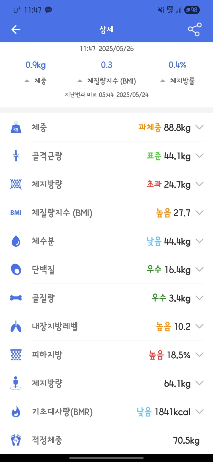 사진은 위에서 부터 시작일 1주차 2주차 3주차 4주차이다. 촬영과 허리둘레 측정시 배에 힘주지 않고 최대한 내민 상태로 찍었다. 피부 진짜 너무 하얀데.. 몸 좋아지면 태닝 고민해야겠다. 워치상태가 좋지 않아서 체중계 값으로 체성분을 측정을 진행한다. 5주차 시작을 85시간 단식과 함께 진행한다. 몸무게는 화장실을 제대로 못가서 가장 많이 나가는 상태의 무게이다. 허리둘레의 경우 변화가 1도 없었다. 치팅이아니었다면 1~2cm정도 감소했을 것이다. 5주차는 측정이 가능하면 취침전 체중과 기상후 체중을 모두 비교해 볼 예정이다.
