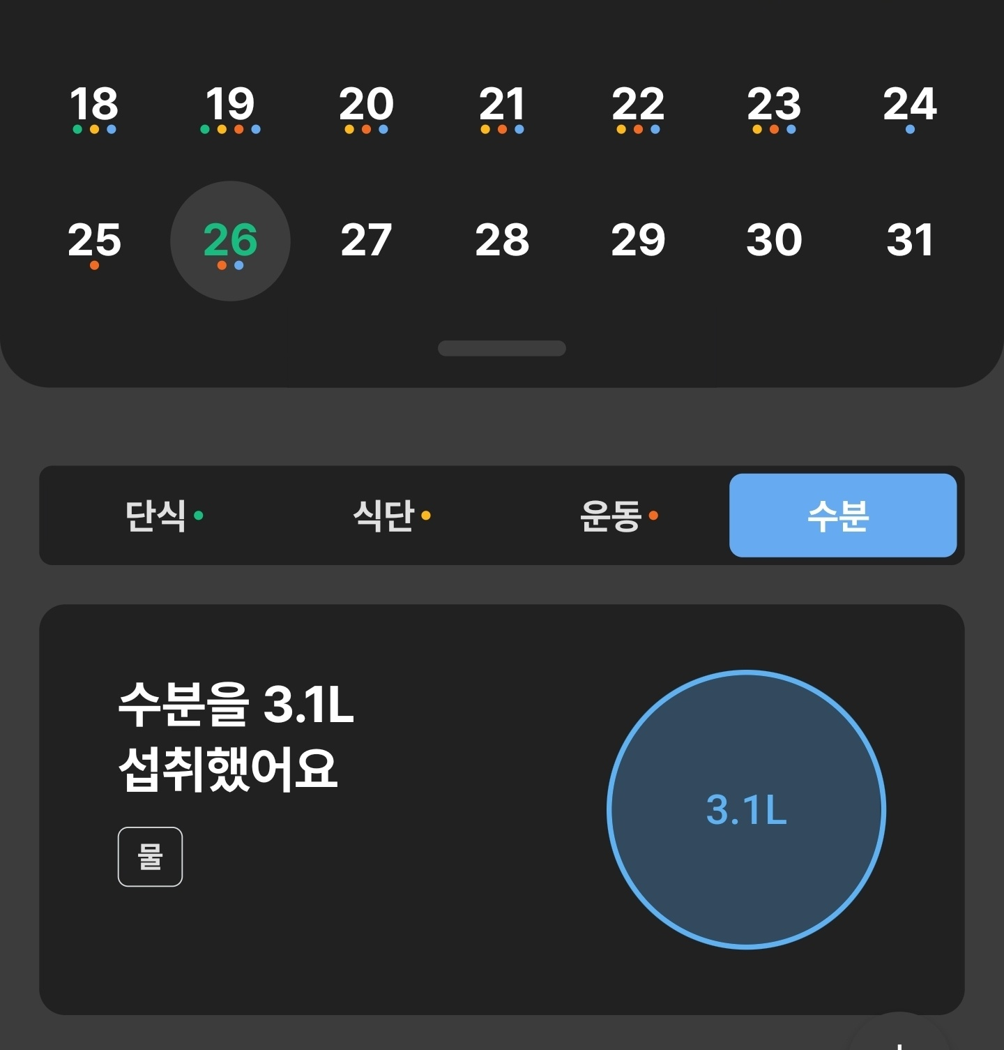 휴식 사이에 마시면서 3.1L 정도 마셨다. 미온수만 먹으니 화장실을 덜 간다. 내몸에 미온수가 맞는 듯하다. 최대한 4리터를 목표로 섭취해야겠다. 총 3.1L 섭취 완료